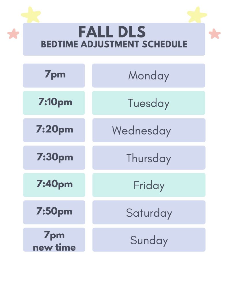 - This will get them used to going to bed a tiny bit earlier so when that first night of DLS hits, they will already be on that schedule!